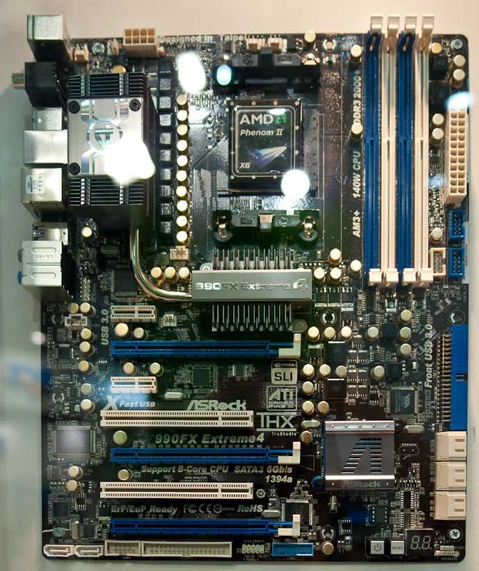 Die Mainboards mit der CPU-Fassung AM3+ für die ebenfalls in 32 nm Strukturgröße gefertigten FX-Prozessoren mit Bulldozer-Kern ähneln stark ihren Vorgängern mit Chipsätzen der 800er-Serie. Die Northbridges 990FX, 990X und 970 kommunizieren mit der CPU nun per Hypertransport 3.1 mit bis zu 6,4 Gigatransfers pro Sekunde (HT 3.0: 5,2 GT/s). Darüber hinaus unterstützen sie die I/O-Virtualisierung mit IOMMU. [Update:]Die Boardhersteller geben die maximale Thermal Design Power mit 140 Watt an. AMD wird diesen Wert bei den Bulldozer-CPUs aber vermutlich nicht ausschöpfen, sondern CPUs in den gebräuchlicheren TDP-Klassen 95 Watt und 125 Watt anbieten.[/Update] Seit April lizenziert Nvidia die Multi-GPU-Technik SLI auch für Mainboards mit AMD-Chipsatz, wovon die Board-Hersteller insbesondere bei den teuren 990FX-Modellen regen Gebrauch machen