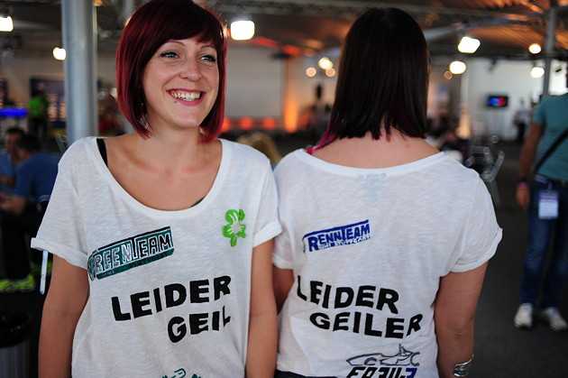 Hockenheim, 5. August 2012 – Die jungen Damen machten Werbung für die zwei Teams der Uni Stuttgart. Und sie waren nicht zu übersehen. "Leider geil" stand doppeldeutig auf der Vorderseite des T-shirts, zusammen mit dem Logo des "GreenTeams", das in der FSE (Formula Student Electric) antrat. Und auf der Rückseite hieß es "Leider geiler", zusammen mit dem Logo des "RennTeams", das für die FSC (Formula Student Combustion) gemeldet hatte. Zum Abschneiden der Stuttgarter passten die Sprüche, denn die Stuttgarter belegten am Ende den dritten Platz in der FSE und den ersten in der FSC.