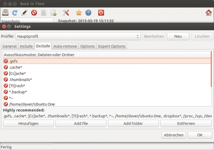 Unter "Include/Einbeziehen" wählt man die zu sichernden Ordner, über "Exclude/Ausschließen" lassen sich gezielt Dateien und Ordner anhand ihres Namens oder ihrer Dateiendung von der Sicherung ausnehmen. Eine Reihe von Einträgen ist hier bereits vorhanden, diese schließen beispielsweise typische Cache-Dateien und Sicherungskopien von Texteditoren mit vorangestellter Tilde aus.