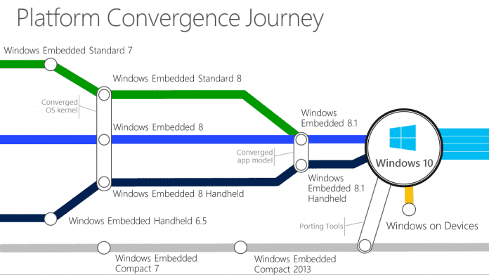 Auf der Hardware-Entwickler-Konferenz WinHEC 2015 im Shenzhen hat Microsoft Pläne für Windows 10 für Embedded Systems und das Internet of Things (IoT) erläutert. Demnach soll Windows 10 eine Vereinheitlichung bei den Embedded-Versionen bringen, von denen es bisher verwirrend viele Versionen gibt. Geplant sind drei Varianten: Window 10 IoT for Industrial Devices, ... for Mobile Devices und ... for Small Devices. Die letztgenannte Version kommt ohne grafische Oberfläche und kann sich mit 256 MByte RAM begnügen, aber trotzdem (passende) Universal Apps ausführen.