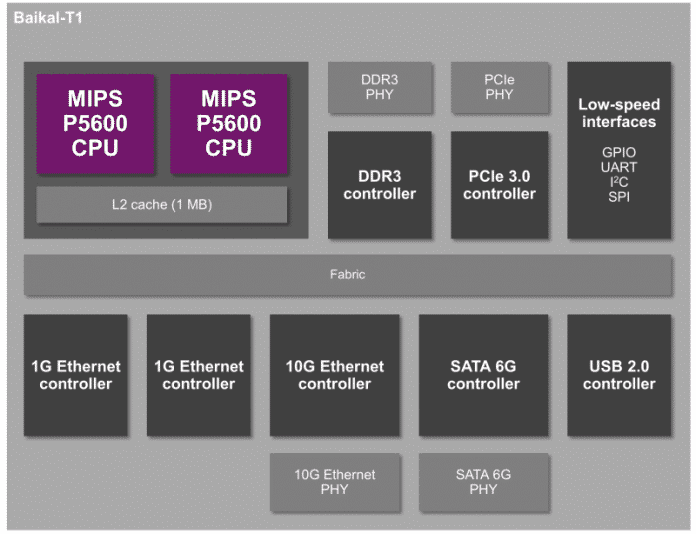Der T1 von Baikal Electronics (Байкал Электроникс) ist für Router, Switches und andere Netzwerkgeräte gedacht: Außer CPU-Kernen und Speicher-Controller sind auch einige Controller für 1- und 10-Gigabit-Ethernet, PCI Express 3.0, SATA 6G und USB enthalten. Der taiwanische Auftragsfertiger TSMC stellt den Baikal-T1 mit 28-Nanometer-Technik her, die Leistungsaufnahme soll bei 5 Watt liegen.
