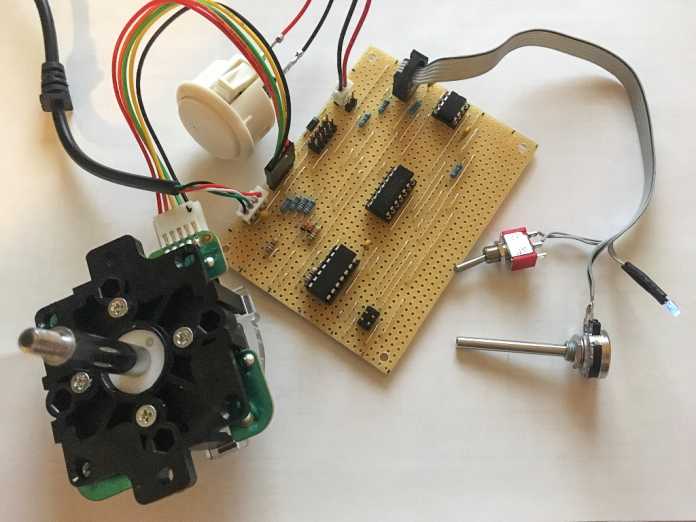 In der ersten Entwicklungsstufe habe ich die USB-Komplexitäten mit einer zugekauften Platine gelöst. In meiner Projektdokumentation auf Gitlab ist dies als Version 2 zu finden. In der Version 3 ist diese Platine durch einen deutlich billigeren IC auf der Hauptplatine ersetzt, einen ATtiny84A Microcontroller (Kosten: ca. 1 Euro). Dank des Projekts V-USB der österreichischen Firma Objective Development, und dank zahlloser Beispielprojekte, habe ich dem 14-beinigen IC mit wenig Aufwand USB beigebracht und hieve meine ansonsten antike TTL-Elektronikschaltung ins 21. Jahrhundert. Als besonderes Schmankerl ist es sogar möglich, den Namen selbst zu bestimmen, mit dem sich der Joystick als USB HID (Human Interface Device) beim Betriebssystem anmeldet. Das kommt der Tradition von ausgefallenen, superlativen Joysticknamen sehr entgegen.