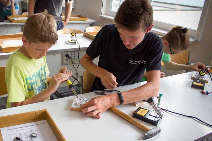 Die Vorlagen wurden vorab noch mit den Reißzwecken bestückt und alle Teile auf Tabletts zurechtgelegt. Dann konnte es losgehen. Das Projekt war zeitlich offen, so dass sich die 10 angebotenen Plätze nach und nach füllten. In der Regel waren die Kinder gut zwei Stunden mit dem Löten beschäftigt. Für die meisten war es das erste Mal überhaupt, dass sie einen Lötkolben in der Hand hatten. Dank der breiten Reißzwecken war es jedoch einfach, gut leitende Verbindungen zu setzen. Ein selbst angefertigtes Produkt mit nach Hause zu nehmen ist für die Schüler immer was Besonderes. Dass man mit bloßen Fingern auf der Orgel spielen kann, sorgte ebenfalls für große Faszination. Zwar sorgt der Körperwiderstand für eine ordentliche Schieflage der Töne, aber darum ging es beim abschließenden „Konzert“ gar nicht mehr.