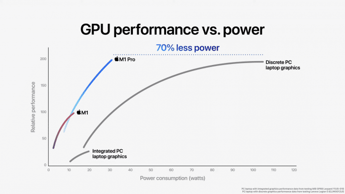 In mehreren Grafiken veranschaulicht Apple die Effizienz sowohl des M1 Max als auch die des M1 Pro mit halb so starker GPU (16 Kerne, 2048 Shader). Das Topmodell soll bei einer Leistungsaufnahme von weniger als 60 Watt vergleichbar schnell sein wie eine mobile GeForce RTX 3080 in einer Konfiguration mit 95 Watt – die wiederum in etwa auf dem Niveau einer Desktop-GeForce-RTX-3060 liegt. Darf die mobile GeForce RTX 3080 etwa 160 Watt aufnehmen, kommt der M1 Max nicht mehr ganz hinterher, hat dann aber einen deutlichen Effizienzvorteil. Auf dem Papier könnte es der M1 Max sogar mit AMDs Kombiprozessoren der aktuellen Spielekonsolen Playstation 5 und Xbox Series X aufnehmen.