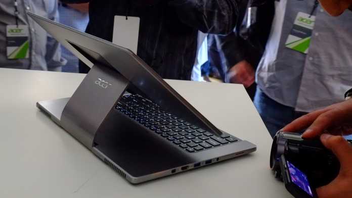 Das Aspire R7 ist ein Windows-Notebook mit besonderer Aufhängung, die das Display über die Tastatur erhebt – und das anders als bisherige Konzepte dieser Art auch einen Tablet-Modus erlaubt. Die Tastatur liegt am vorderen Rand, das Touchpad ungewöhnlicherweise direkt dahinter. Besonders viel Aufmerksamkeit will Acer der Abstimmung des Scharniers gewidmet haben, sodass das touchfähige Display nicht in übermäßige Schwingungen gerät. Ab 15. Mai soll das R7 erhältlich sein.
