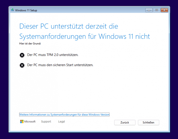 "Dieser PC erfüllt die Mindestsystemanforderungen für die Ausführung von Windows 11 nicht. Diese Anforderungen tragen dazu bei, eine zuverlässigere und qualitativ hochwertigere Benutzererfahrung zu gewährleisten. Die Installation von Windows 11 auf diesem PC wird nicht empfohlen und kann zu Kompatibilitätsproblemen führen. Wenn Sie mit der Installation von Windows 11 fortfahren, wird Ihr PC nicht mehr unterstützt und ist nicht mehr zum Empfang von Updates berechtigt. Schäden an Ihrem PC aufgrund unzureichender Kompatibilität fallen nicht unter die Herstellergarantie."
