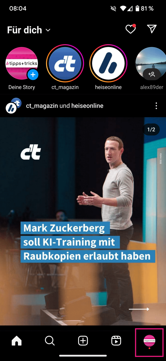 - Ă–ffnen Sie Ihr Instagram-Profil in der App und tippen Sie oben rechts auf das Burger-MenĂĽ.