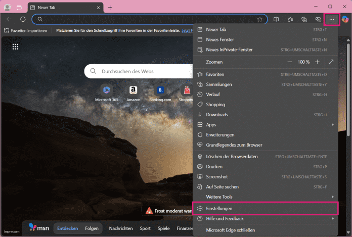 - Öffnen Sie in Microsoft Edge das Drei-Punkt-Menü oben rechts und gehen Sie auf "Einstellungen".
