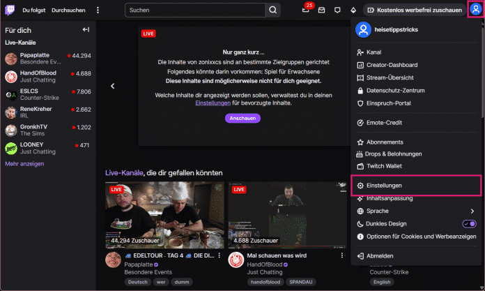 - Klicken Sie oben rechts auf Ihr Profilbild und dann auf "Einstellungen".