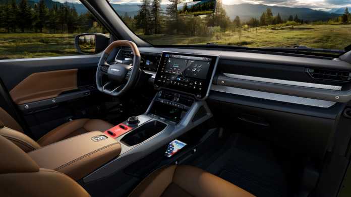 With an engine like in the Recon, it is therefore all the more important that the surplus power is managed so cleverly by the electronics that all four wheels achieve maximum propulsion even with poor grip, instead of spinning aimlessly. Interestingly, despite the powerful engines, the drive concept relies on a mechanical off-road gear ratio of 15:1 in the rear and 13:1 in the front drive module. With the 33-inch traction tires of the optional Moab equipment, this results in ground clearance of around 23 centimeters, typical for off-road vehicles, approach angles of 34 degrees at the front and 34.5 degrees at the rear, and a breakover angle of 23.5 degrees. With the standard 265/70R18 all-terrain tires, all values are naturally slightly smaller.