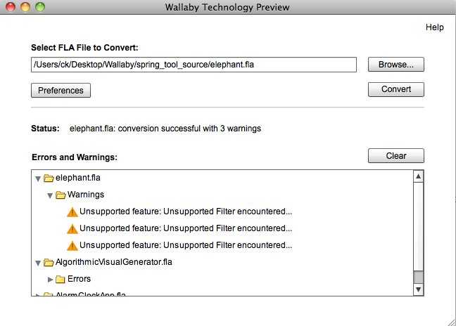 Die Software ist für Windows und Mac OS X verfügbar, befindet sich jedoch noch im Experimentierstadium. [Update: In einem kurzen Test mit bei Adobe verfügbaren Flash-Dateien beklagte sich Wallaby häufig über ein nicht kompatibles FLA-Format, lediglich mit einem CS5-Beispiel funktionierte es. Die Release-Notes für Wallaby informieren etwas detaillierter über die Fähigkeiten des Produkts. So kooperiert es zurzeit lediglich mit den Browsern Chrome und Safari. ActionScript wird noch nicht unterstützt, dasselbe gilt für Filter, Video und Audio. Für die letzten beiden bietet HTML 5 eigene Elemente an.