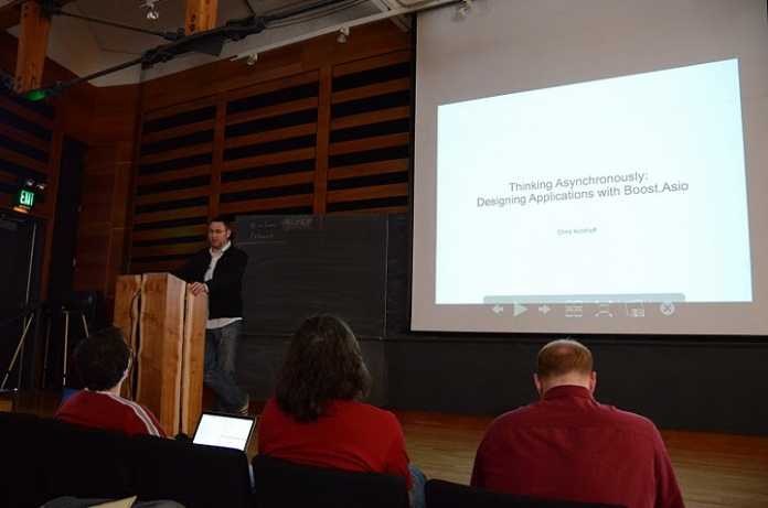 Christopher Kohlhoff, Autor der populären Bibliothek Boost.Asio, flog aus Australien ein und erläuterte, wie seine Bibliothek asynchrone Operationen in C++ ermöglicht. So lassen sich Operationen, die bisher den Aufruf einer blockierenden Funktion erforderten und einen Thread blockierten, asynchron aufrufen: Anstatt in einer blockierenden Funktion auf den Abschluss einer Operation zu warten, ruft Boost.Asio eine Funktion auf, wenn die entsprechende Operation beendet wurde. Auf diese Weise kann ein Thread nach der Initiierung einer asynchronen Operation bis zu ihrem Abschluss andere Aufgaben erledigen.