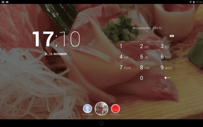 Sinnvollerweise aktiviert jeder Nutzer unter Einstellungen/Sicherheit/Display-Sperre einen Zugangsschutz, der je nach Vorliebe mit Passwort, PIN, Face Unlock oder Wischmuster aufgehoben werden kann. Per Einstellungsmenü oben rechts schaltet man zwischen den Nutzerkonten um, wobei Nickname und Profilfoto angezeigt werden. Verräterisches Gimmick dabei: Schon zur Eingabe des eigenen Passworts wird das individuelle Hintergrundbild angezeigt, man sollte also nur familientaugliche wählen. Auch die Status-Icons werden dann schon eingeblendet, freilich ohne Möglichkeit, auf das Menü zuzugreifen. Selbst nicht angemeldete Anwender sehen also immerhin, welche Nutzer neue Mails, Facebook-Chats oder ähnliches erhalten haben.
