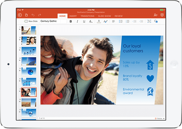 In Excel enthält die Auswahlliste "Recommended" die für die ausgewählten Daten passenden Diagramm-Arten, diese Funktion ist selbst in den Desktop-Versionen noch nicht zu finden. Powerpoint unterstützt viele der unter Windows bekannten Übergangseffekte. Dokumente der Apps sollen sich verlustfrei zwischen iPad, Cloud, PC und Mac austauschen lassen, beispielsweise über den Daten-Synchronisierungsdients Microsoft OneDrive (vormals Skydrive).
