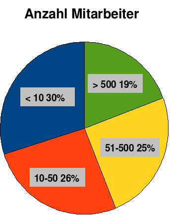 Von den Befragten gehören 30 Prozent kleinen Unternehmen mit weniger als 10 Mitarbeitern an, 51 Prozent mittelständischen Unternehmen und 19 Prozent Unternehmen mit mehr als 500 Mitarbeitern: