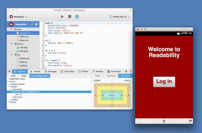 Zu Beginn kann der Nutzer aus einer Reihe von App-Vorlagen wählen, die sich dann in WebIDE anpassen lassen. Im jetzigen Stadium hilft das Werkzeug mit Syntax Highlighting für HTML, CSS und JavaScript. Ein eingebauter Application Validator soll außerdem dabei unterstützen, häufig vorkommende Fehler aufzudecken, bevor sich die fertige App an den Firefox Marketplace übermitteln lässt. Möchte man die Applikation im Anschluss testen, lässt sich wohl eine Laufzeitumgebung auswählen und entweder Hilfestellungen zur Verbindung mit einem Gerät mit Firefox OS erscheinen oder Firefox-OS-Simulatoren werden installiert, über die dann Zugriff auf die aus der Firefox-Desktop-Variante bekannten Werkzeuge zum Überprüfen besteht.