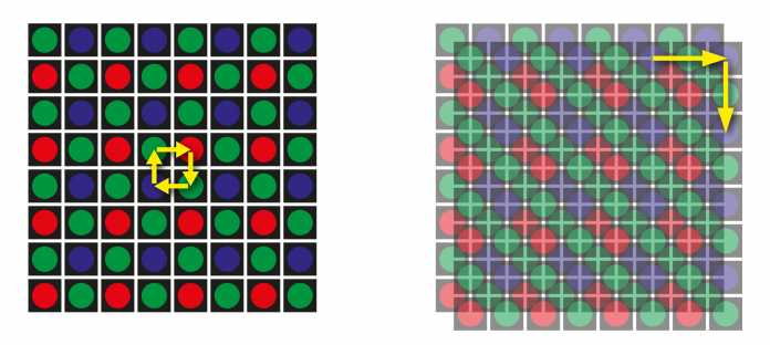 Multi-Shot soll außerdem Moiré eliminieren und die Farbwiedergabe verbessern. Für ein 200-Megapixel-Bild braucht man entweder vier oder sechs Einzelaufnahmen. Einen Vergleich der verschiedenen Modi (Normalmodus, 4-fach Multi-Shot, 6-fach Multishot) gibt es in der Bilderstrecke. Schon ein vierfach Multi-Shot-Bild gewinnt gegenüber einer konventionellen Einzelaufnahme sichtbar. Der Bildversatz zwischen den Einzelaufnahmen beträgt hier gerade einmal ein halbes Pixel. Das Maximum an Bildqualität erreicht man dann mit einer 6-fachen Multi-Shot-Aufnahme. Dabei veträgt der Bildversatz zwischen den Aufnahmen ein Pixel.