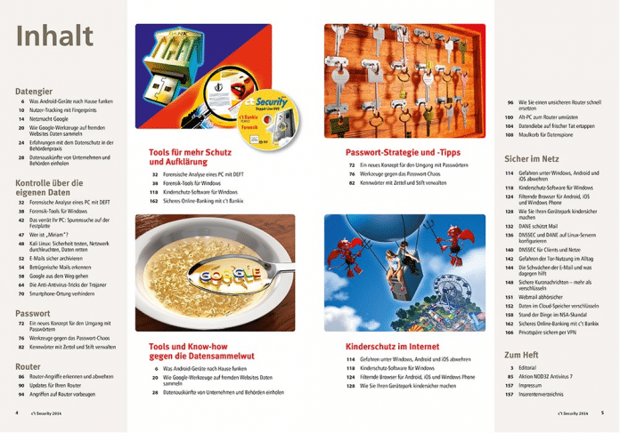 Auch die allgegenwärtige Datenspionage inklusive wirksamer Gegenmittel ist Thema – behandelt werden beispielsweise der Stand der Dinge im NSA-Skandal, wie man Webmail abhörsicher macht, Daten im Cloud-Speicher verschlüsselt oder wie man seine Privatsphäre mittels VPN wieder herstellt. Ein weiterer Artikelschwerpunkt zum Thema "Kinder im Netz" zeigt, wie Sie Ihren Gerätepark kindersicher machen oder welche kindgerechten Browser es gibt.