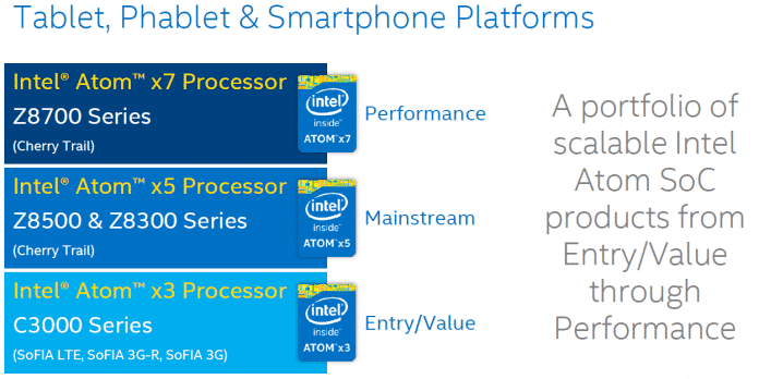 Auf dem MWC gibt Intel auch einen Ausblick auf die "Cherry Trail"-Atoms der Baureihen x7-Z8700, x5-Z8500 und x5-Z8300. Sie sollen noch im ersten Halbjahr 2015 erscheinen und ihre 22-nm-Vorgänger "Bay Trail" ablösen – also Atom Z3795 oder Z3740, die in Windows-8- und Android-Tablets stecken.