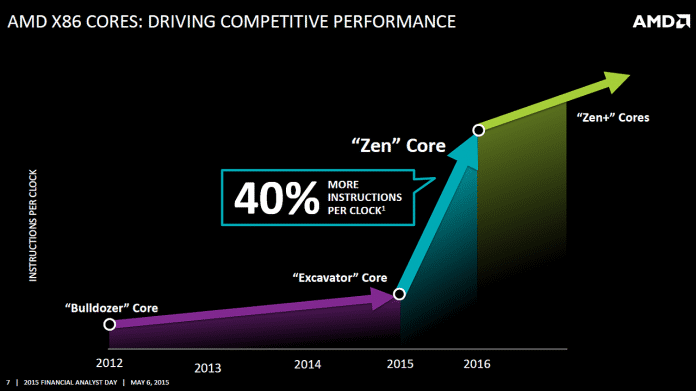 Zen unterstützt Hyper-Threading und soll pro Taktschritt 40 Prozent mehr berechnen als Carrizo; konkrete Taktfrequenzen nannte AMD dabei aber nicht. Je nach System kann Zen DDR3- oder DDR4-SDRAM ansteuern. Einen genaueren Termin für Zen nannte AMD nicht. Wenn man berücksichtigt, dass der für die erste Hälfte 2015 angekündigte Carrizo bisher noch nicht erschienen ist, sind Zen-Prozessoren kaum vor Mitte 2016 zu erwarten.