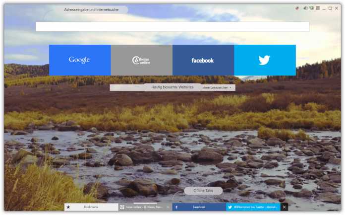 Besonders auffällig und eigenwillig ist die Bedienoberfläche des Browsers: Sie ist extrem zurückhaltend gestaltet. So ist die Adresseingabe samt Suchfunktion und Bookmarks erst zu sehen, wenn man die Titelleiste anklickt. Die Browser-Tabs sind am unteren Fensterrand angeordnet, die Reihenfolge lässt sich beliebig ändern. Sind mehrere Unterseiten einer Website geöffnet, gruppiert sie der Browser platzsparend in ein Tab. Eingefärbt sind die Browser-Tabs zudem in der Hauptfarbe der Webseite.