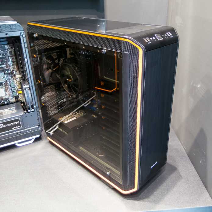 Der Big-Tower Dark Base Pro 900 von Be quiet! lädt Smartphones drahtlos über eine induktive Ladestation nach Qi-Standard im Gehäusedach auf. Durch seine modulare Bauweise lässt sich der Tower zerlegen und individuell an die Hardware-Komponenten anpassen. Der Mainboard-Träger lässt sich zur leichteren Montage aus- und auf Wunsch auch kopfüber einbauen, sodass sich die Steckkarten oberhalb des Prozessors befinden. Alle sieben 2,5“/3,5“-Laufwerksschächte sind in einzeln entfernbaren Käfigen untergebracht. Eine im Gehäuse integrierte Lüftersteuerung kontrolliert die drei installierten PWM-Lüfter und kann alternativ im Hub-Modus das PWM-Signal vom Board an die Ventilatoren weiterreichen.