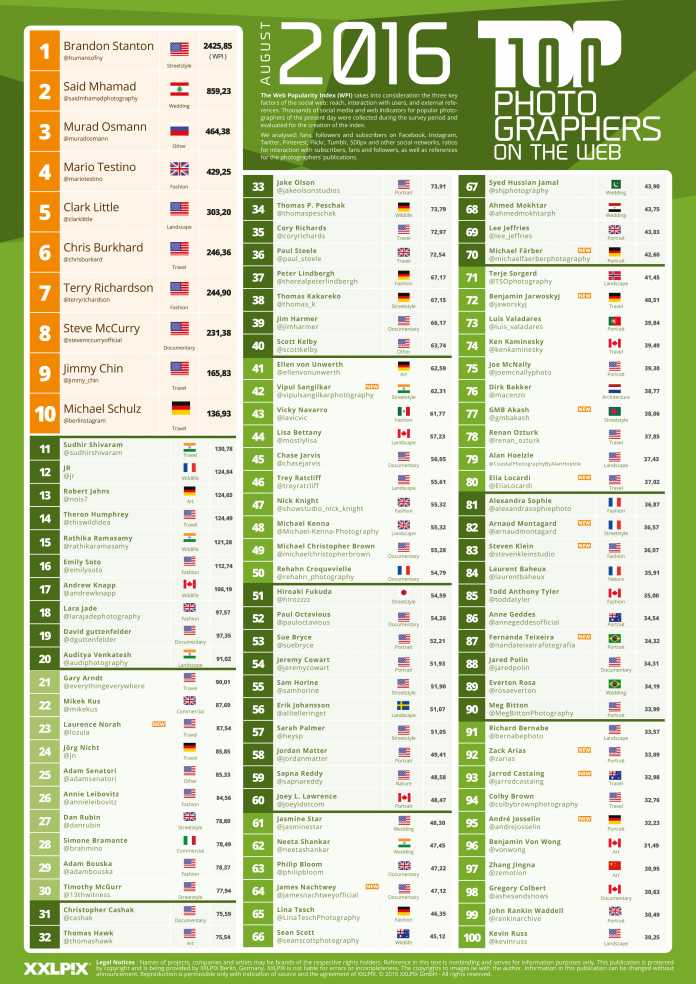 Dieser WPI-Score beträgt etwa für Brandon Stanton 2425,85. Stanton erreicht laut XXLPIX mit seinen Fotografien mehr als 23 Millionen Menschen weltweit. Platz zwei im Gesamt-Ranking belegt der libanesische Hochzeitsfotograf Said Mhamad mit einem WPI-Score von 859,23. Michael Schulz hat mit seinen nach Angaben von XXLPIX etwa 500.000 Fans einen WPI-Score von 136,93.