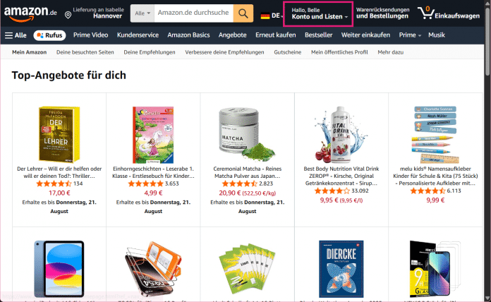 - Klicken Sie im oberen Bereich der Seite auf "Konten und Listen", um das Menü zu öffnen.