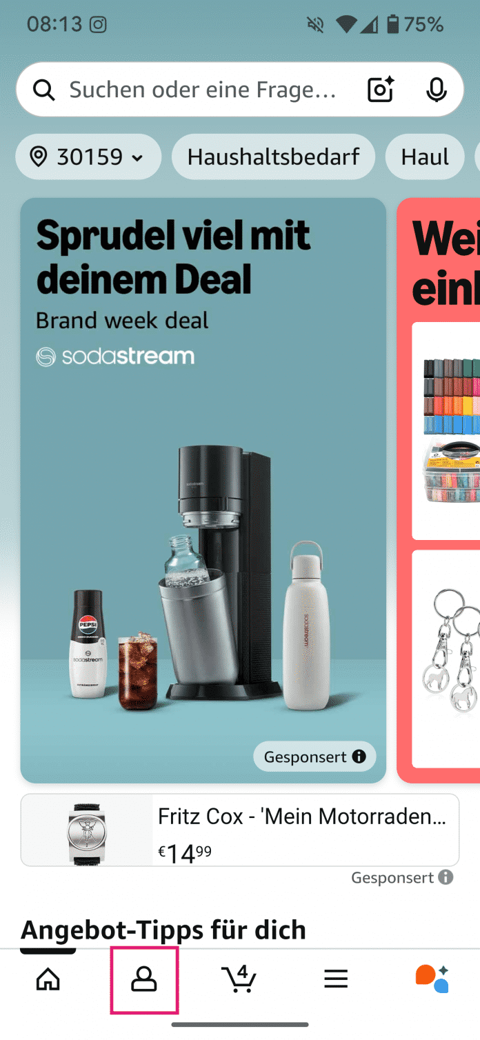 - Öffnen Sie die Amazon-App auf Ihrem Smartphone und tippen Sie unten auf das Symbol mit dem Männchen, um Ihr Profil aufzurufen.