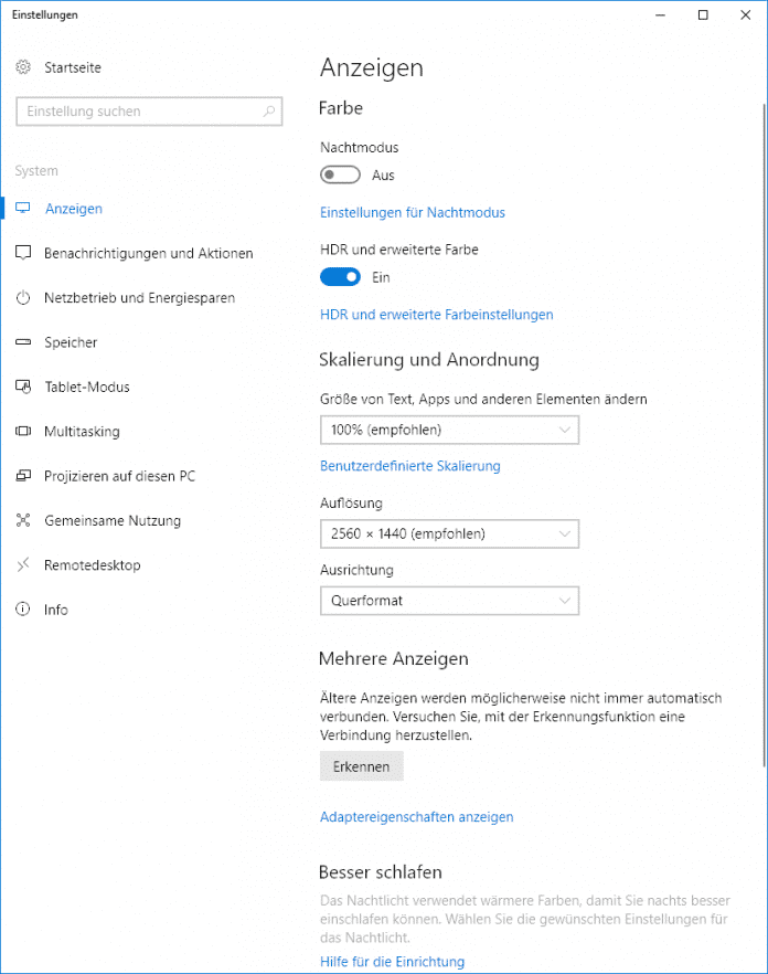 Theoretisch beherrscht auch die integrierte Prozessorgrafik von Kaby-Lake-Prozessoren die HDR-Ausgabe. Praktisch hat es in unserem Test allerdings nicht funktioniert – Windows 10 Fall Creators Update zeigt mit dem aktuellen Intel-Teiber noch nicht einmal die Option "HDR und erweiterte Farbe" in den Anzeigeeinstellungen an. Die Option "HDR-Video streamen" ist zwar vorhanden, aber nicht aktivierbar (ausgegraut).