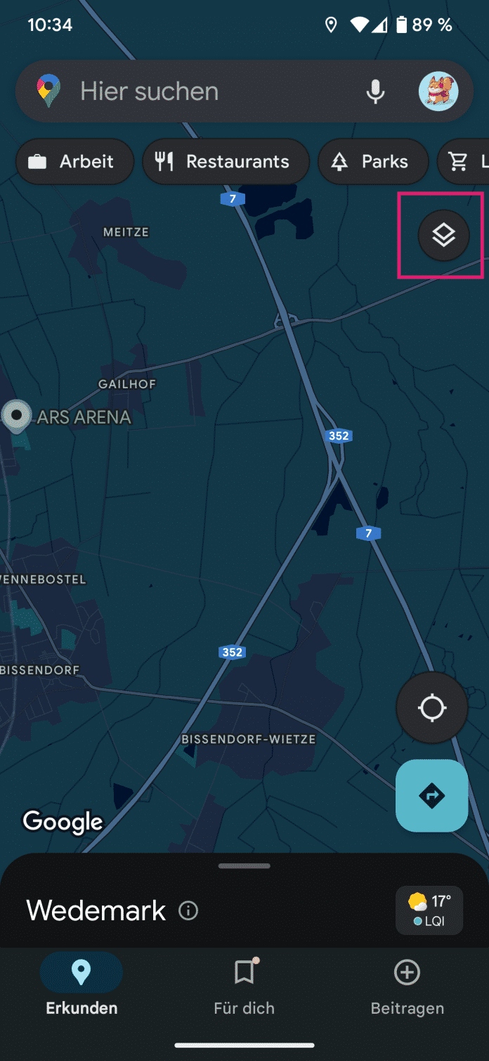 - Oben rechts unterhalb des Suchfeldes tippen Sie auf das Karten-Symbol.