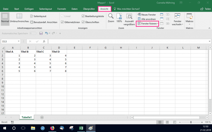 - Klicken Sie nun auf den Reiter "Ansicht" und wählen Sie "Fenster fixieren" aus.