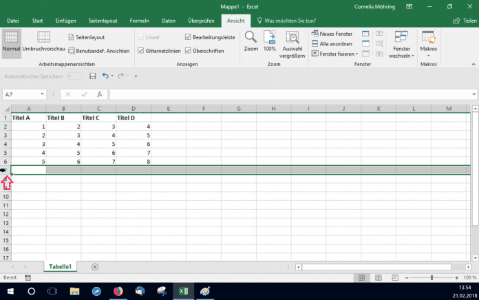 - Beim Klicken mĂĽssen Sie darauf achten, dass Sie links auf die Nummerierung klicken und nicht nur auf eine einzelne Zelle. Sobald ein dicker Pfeil erscheint, der nach rechts zeigt, klicken Sie. Dann haben Sie die gesamte Zeile markiert.