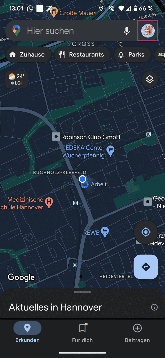 - Öffnen Sie die Google-Maps-App und tippen Sie auf Ihr Profilbild oben rechts.