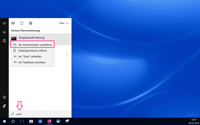 - Öffnen Sie das Startmenü und suchen Sie nach "cmd". Klicken Sie mit der rechten Maustaste auf das Ergebnis "Eingabeaufforderung" und wählen Sie "Als Administrator ausführen" aus.