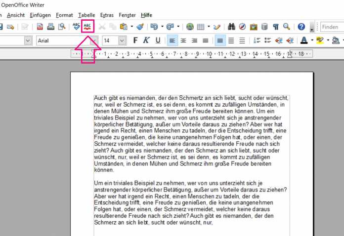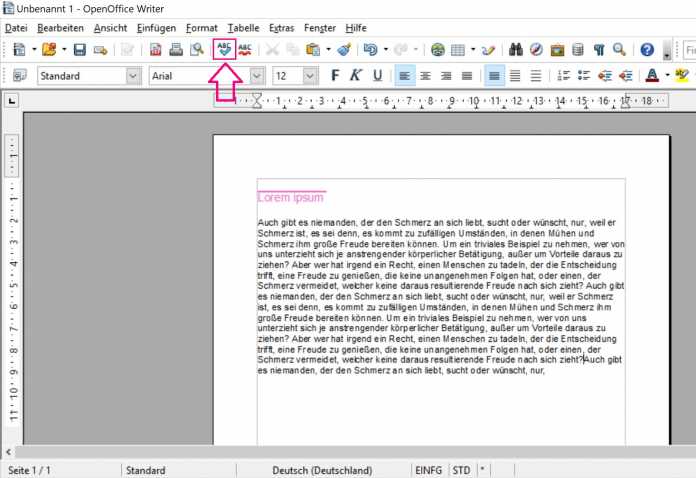 - Erstellen Sie ein neues Dokument bei OpenOffice oder öffnen Sie ein bereits bestehendes Dokument. Klicken Sie im Menüband auf den Button mit dem ABC-Symbol und der roten Linie.