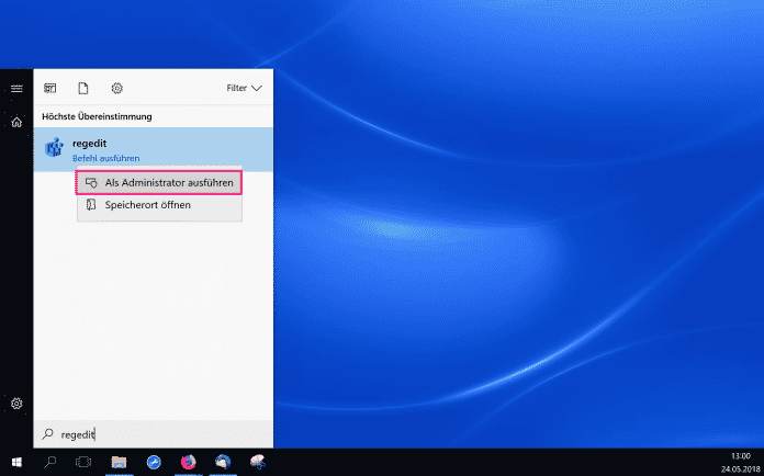 - Klicken Sie mit der rechten Maustaste auf die Kachel "regedit" und wählen Sie "Als Administrator ausführen" aus.