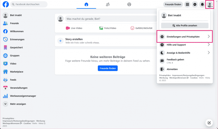 - Nachdem Sie sich auf der Facebook-Website angemeldet haben, klicken Sie oben rechts auf Ihr Profilbild und wählen nacheinander "Einstellungen und Privatsphäre" und dann "Einstellungen" an.