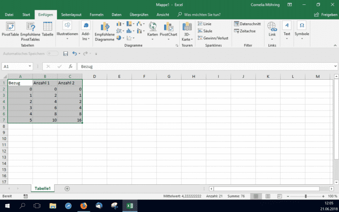 - Klicken Sie auf den Reiter "Einfügen". Hier können Sie bei "Diagramme" einen Diagrammtyp auswählen. Wählen Sie den Typ, der Ihrer Meinung nach am Besten zu Ihren Daten passt.