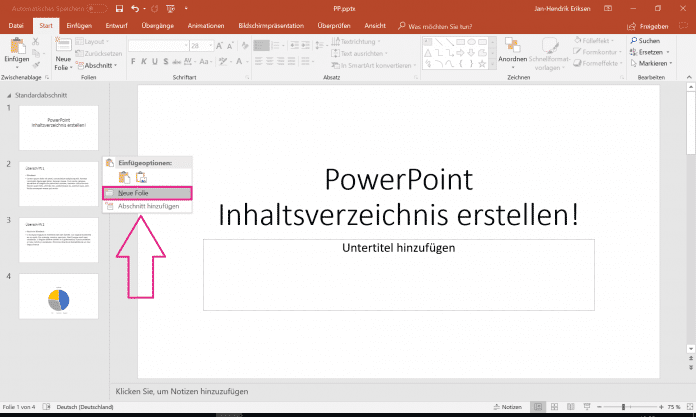 - Erstellen Sie eine neue Folie fĂĽr das Inhaltsverzeichnis.