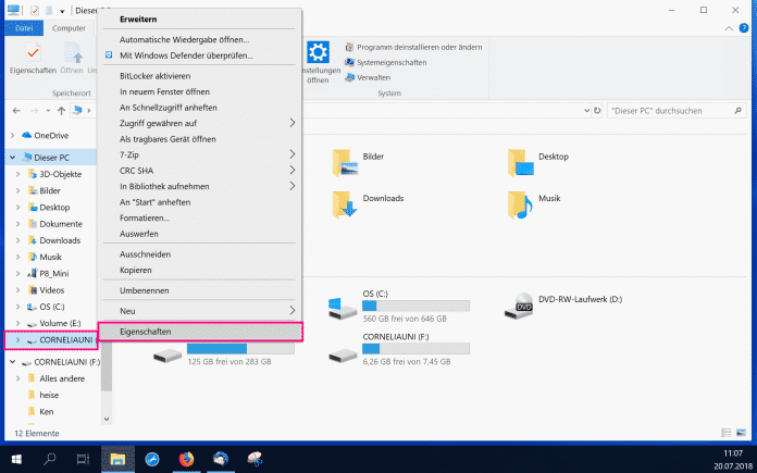 - Gehen Sie mit der rechten Maustaste auf Ihr USB-Speichermedium und wählen Sie "Eigenschaften" aus.