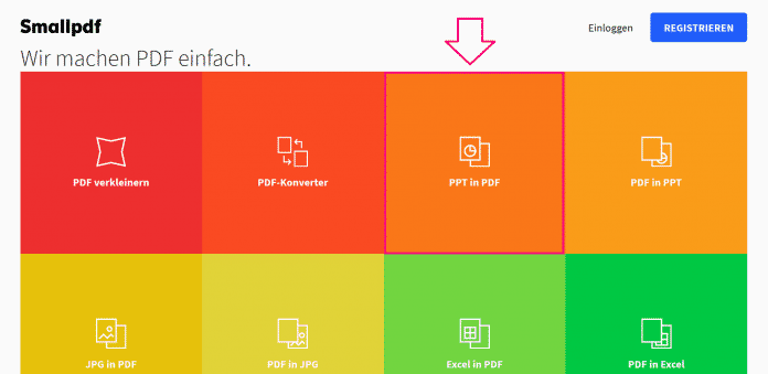 Eine .pdf-Datei aus einer PowerPoint zu erstellen ist sehr einfach. Dabei wird eine PowerPoint-Präsentation so abgespeichert, dass jede Folie als eine einzelne Seite im pdf-Dokument abgespeichert wird. Es gibt verschiedene Tools und Programme, um eine solche Konvertierung vorzunehmen. In unserem Beispiel verwenden wir die Plattform smallpdf.