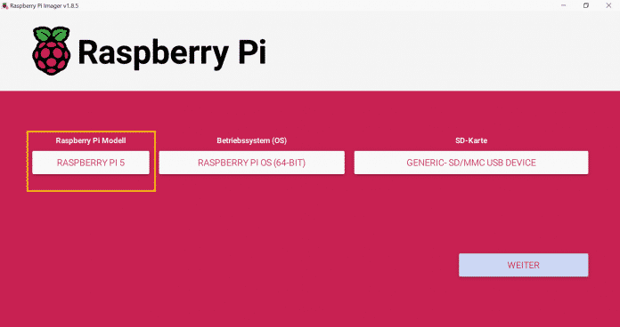 - Rufen Sie den Raspberry Pi Imager auf. Als Erstes mĂĽssen Sie links unter "Raspberry Pi Modell" den Typ Ihres Raspis festlegen.