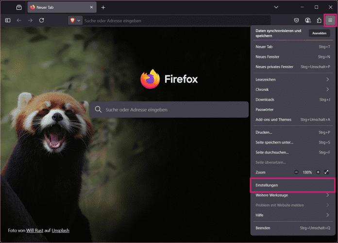 - Ă–ffnen Sie Firefox und klicken Sie oben rechts auf das Drei-Strich-MenĂĽ, dann auf "Einstellungen".