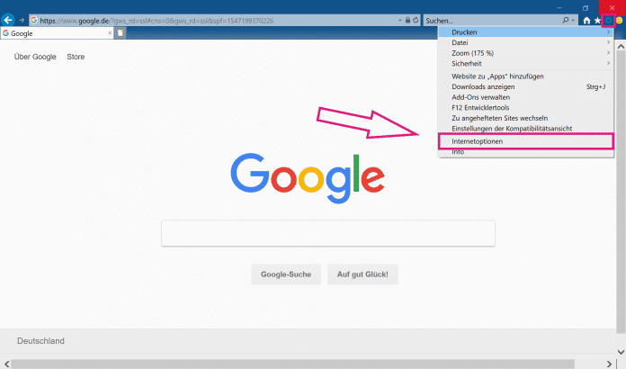 - Klicken Sie im Internet Explorer auf das Zahnrad oben rechts und wählen Sie "Internetoptionen".