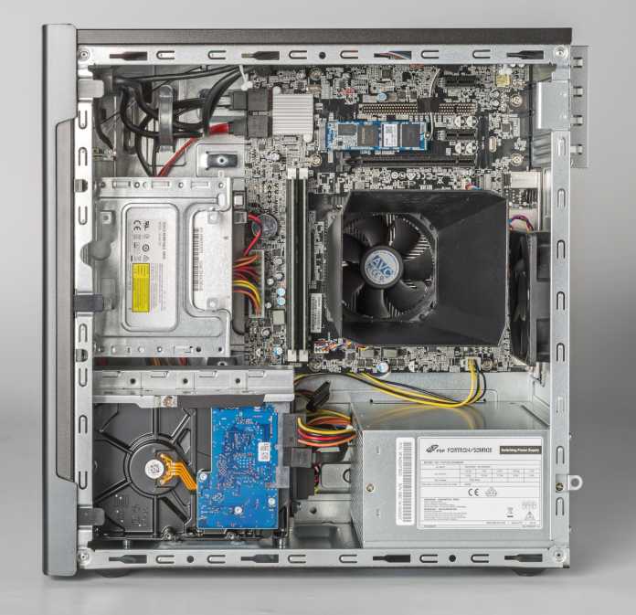 Auch PCI-Express-Karten lassen sich nachrüsten, insbesondere eine Grafikkarte. Das schon seit Jahren in verschiedenen Aldi-PCs eingesetzte 250-Watt-Netzteil von FSP hat aber keine PCIe-Stromkabel; eine Nachrüstkarte muss sich also mit der Leistung aus dem PEG-Slot begnügen. Maximal sind also etwa eine AMD Radeon RX 560 oder eine Nvidia GeForce GTX 1050 Ti möglich. Immerhin hat das Netzteil noch zwei freie SATA-Stromanschlüsse.