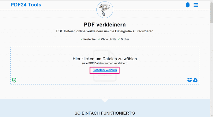 Öffnen Sie die Website für das PDF-Verkleinern-Tool von pdf24.org. Klicken Sie auf "Dateien wählen" und laden Sie die entsprechende PDF hoch.