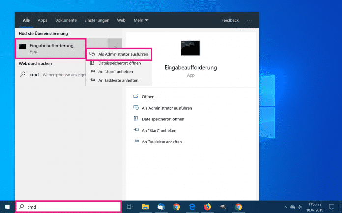 - Geben Sie "cmd" in die Windows-Suchleiste ein und machen Sie einen Rechtsklick auf "Eingabeaufforderung". Anschließend wählen Sie "Als Administrator ausführen".