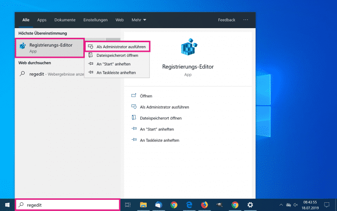 - Geben Sie regedit in die Windows-Suchleiste ein, machen Sie einen Rechtsklick auf den Eintrag "Registrierungs-Editor" und wählen Sie "Als Administrator ausführen".