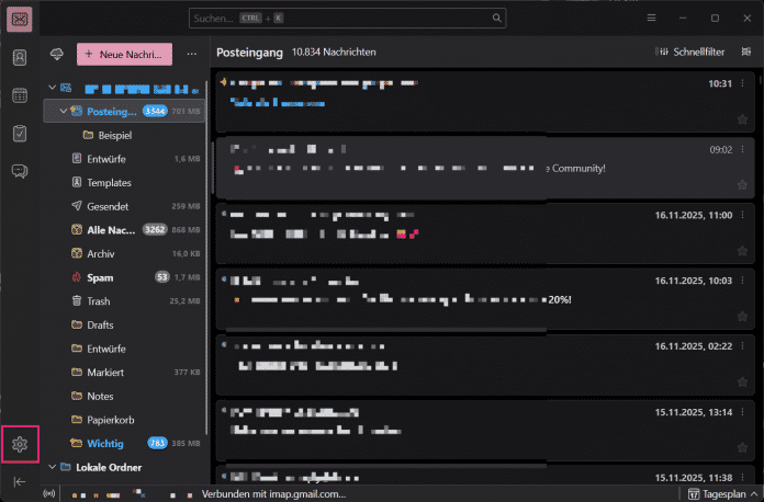 - Ă–ffnen Sie die Thunderbird-Einstellungen ĂĽber das Zahnrad-Symbol unten links.